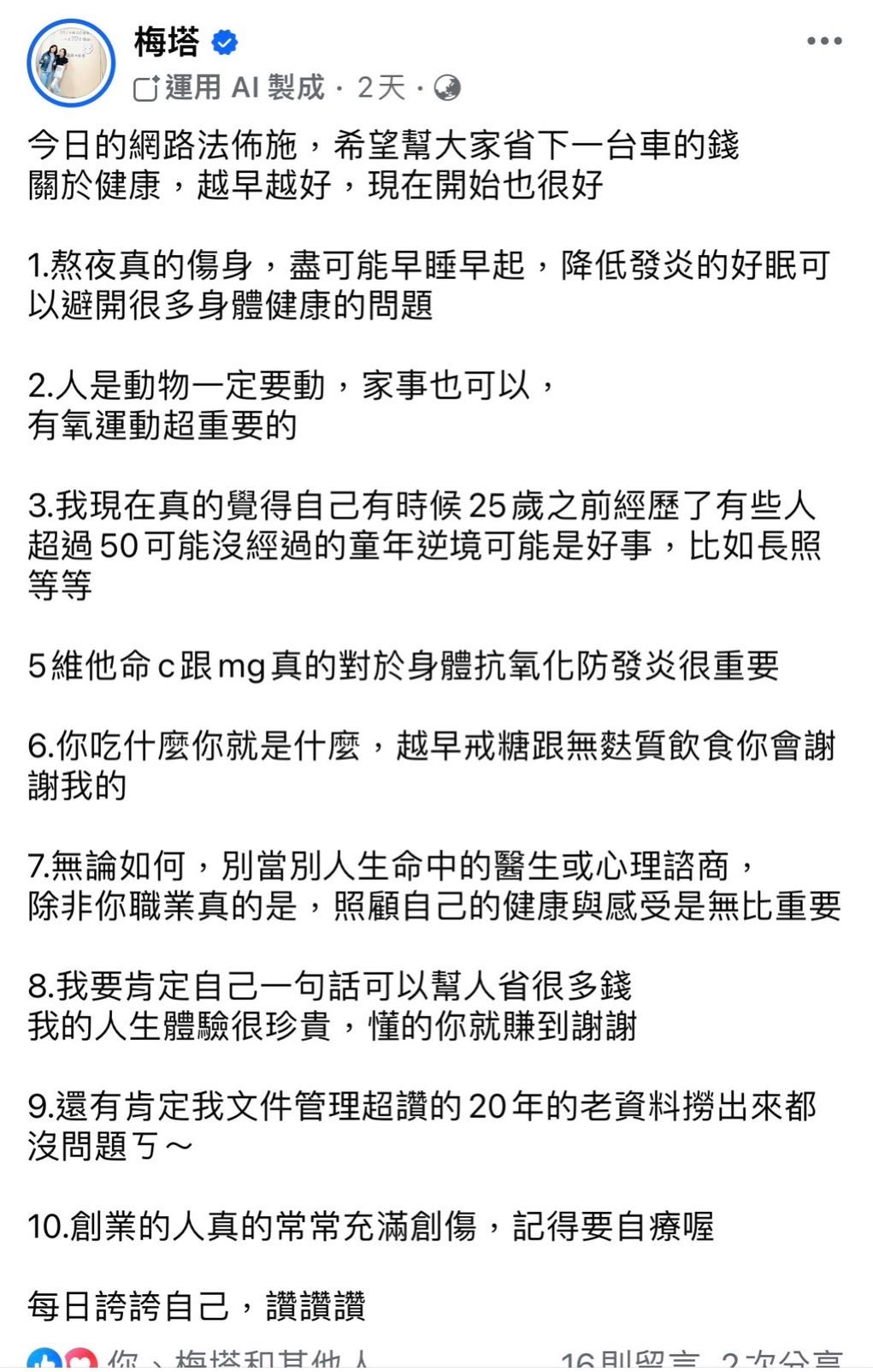 加上前幾天看到網友梅塔的發文(關於健康越早開始實踐越好的事),梅塔是一名自媒體教練,著有自媒體百萬獲利法則:寫給完全素人的「3333網路獲利計畫」。這本書也幫助我自己檢視自己的寫作與自媒體狀態,非常推薦給有興趣的人閱讀。